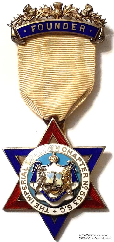 Аверс: в форме шести конечной звезды, образованной двумя, синим и красным, треугольниками. Накладной круг с надписью на белом фоне S.C.+The Imperial Scottish Chapter №553. В центре на голубом фоне двухслойное накладное изображение большого герба (щит, два щитодержателя (единорог и лев), девизная лента с (надписью RA Chapter), мантия, корона).