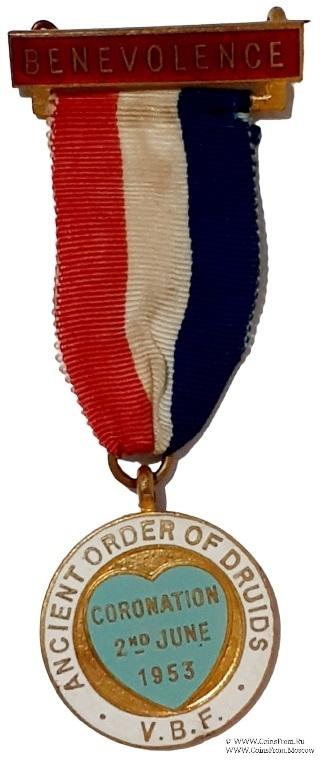 АВЕРС: двойной круг белой эмали с наименованием Ордена – Ancient Order of Druids V.B.F. В центре круга сердце голубой эмали на золотом фоне с надписью: Coronation 2nnd June 1953 (2.06.53 состоялась коронация Елизаветы II).