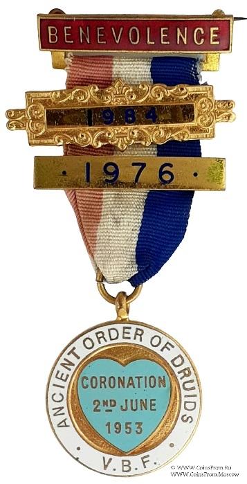 АВЕРС: двойной круг белой эмали с наименованием Ордена – Ancient Order of Druids V.B.F. В центре круга сердце голубой эмали на золотом фоне с надписью: Coronation 2nnd June 1953 (2.06.53 состоялась коронация Елизаветы II).