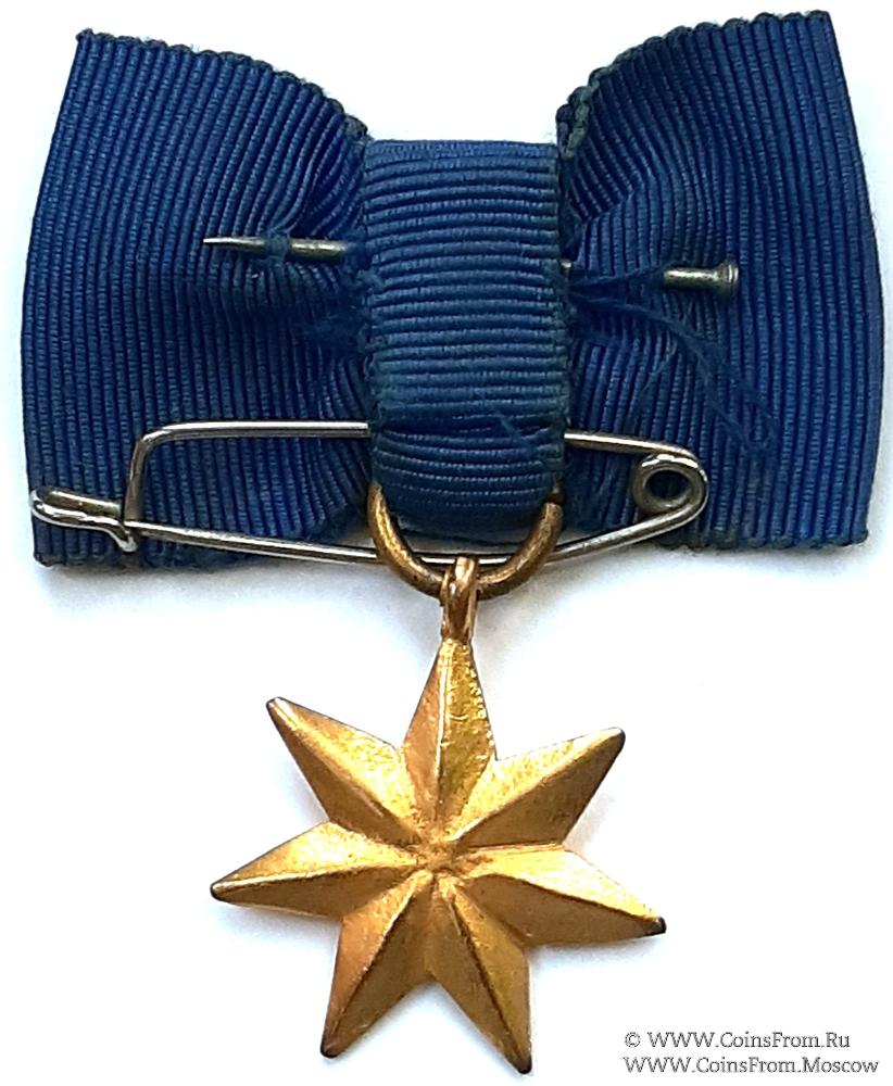 ЗНАК: основной металл, покрытие. АВЕРС: в форме объёмной семи конечной звезды. РЕВЕРС: аналогичный аверсу. КОЛОДКИ/МЕДАЛЬОН: нет. ЛЕНТА: синяя, в форме банта. 25 мм