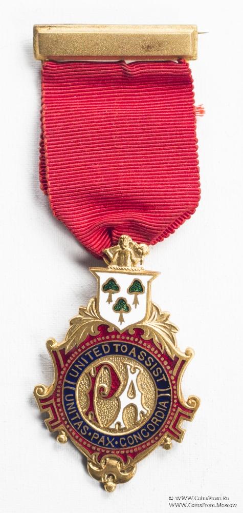 В центре знака буквы РА (PA (Past Arch) - Прошедшему Арку). По кругу надписи на латыни (UNITED TO ASSIST – объединены для помощи; UNITAS. PAX. CONCORDIA – единство мир согласие). Выше герб в виде щита с тремя деревьями, на верху которого фигура человека в правой руке дубина на плече, в левой - дерево.