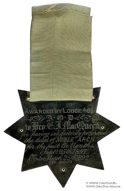 РЕВЕРС: клейма: Trade Mark. ADL, лев, голова леопарда, к, голова королевы (1885). Гравировка: Awarded by Lodge 469. A.O.D. to Bro. G.J. Macqueen for having satisfactorily performed the duties of Noble Arch for the past 6 Months. Sept. 25th 1891. To March 25th 1892. (Награжден Ложей 469. Древнего Ордена Друидов Брат Дж. Маккуин за удовлетворительное выполнение обязанностей Благородный Друид Арки в течение последних 6 месяцев. С 25 сентября 1891 года до 25 марта 1892 г.).