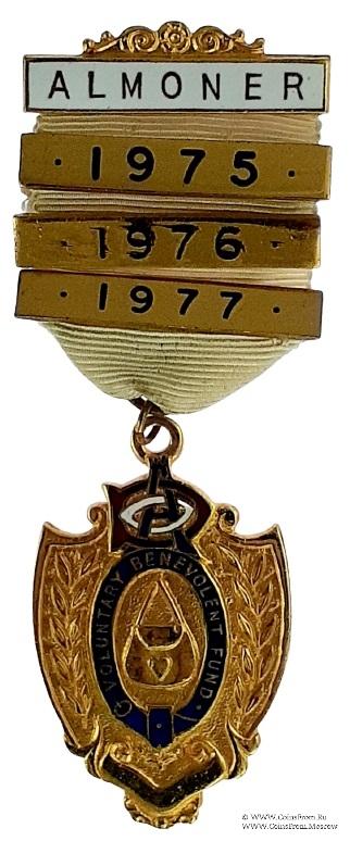 КОЛОДКИ/МЕДАЛЬОН: верхняя колодка прямоугольная белой эмали с надписью Almoner (благотворитель). На ленте 3 медальона прямоугольной формы с датами благотворительности – 1975, 76, 77 гг.