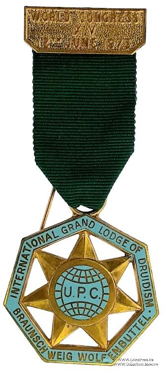 АВЕРС: в форме семиугольника голубой эмали с надписью на английском языке INTERNATIONAL GRAND LODGE OF DRUIDISM. BRAUNSCHWEIG WOLFENBUTTEL - Международная Великая Ложа Друидизма. Брауншвейг - Вольфенбюттель. В семиугольник вписана семи конечная звезда, в центре которой изображение глобуса с буквами U.P.C.