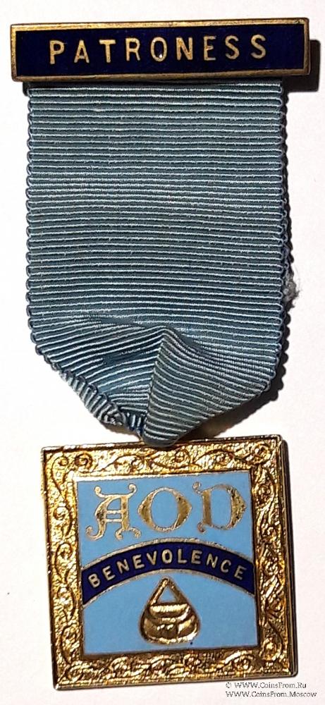 Знак квадратной формы. По краю орнамент на золотом фоне. Центр знака голубой эмали с надписью AOD - Ancient Order of Druids – Древний Орден Друидов. Ниже надписи на ленте синей эмали надпись на английском языке BENEVOLENCE– благотворительность. Под лентой золотое изображение сумки.