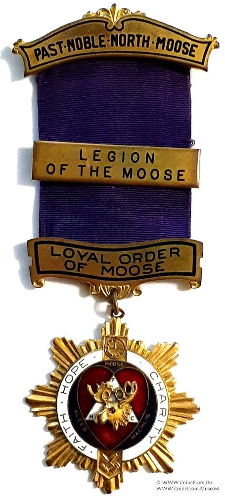 КОЛОДКИ/МЕДАЛЬОН: верхняя колодка с надписью Past Noble North Moose – Прошлый Благородный северный Лось. В центре ленты медальон прямоугольной форма с надписью: Legion of the Moose (Легион Лося). Нижняя колодка в виде ленты с наименованием Ордена – Loyal Order of Moose – Лояльный Орден Лося.