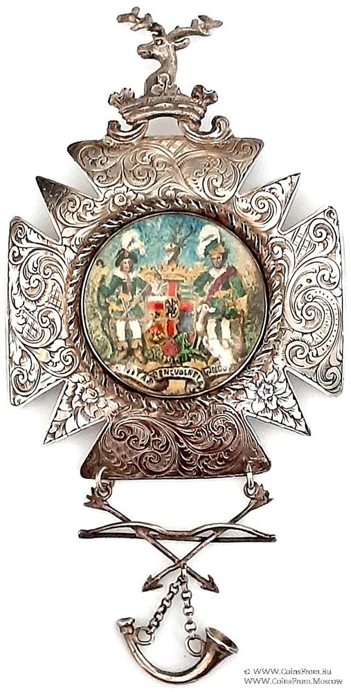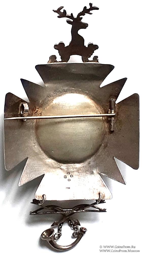 Аверс: в форме креста, украшенного гравировками. В центре цветное изображение большого герба Ордена Лесников с двумя щитодержателями мужчинами (такое изображение применялось до 1892 года, позже одним из щитодержателей изображалась женщина). В нижней части герба девиз на латыни «Unitas, Benevolentia, Concordia» (Единство, Доброжелательность, Гармония). Верх креста украшен головой венценосного оленя. К нижнему лучу креста прикреплены символы Ордена: лук со стрелами и охотничий рог. Характерный атрибут для ранних знаков.