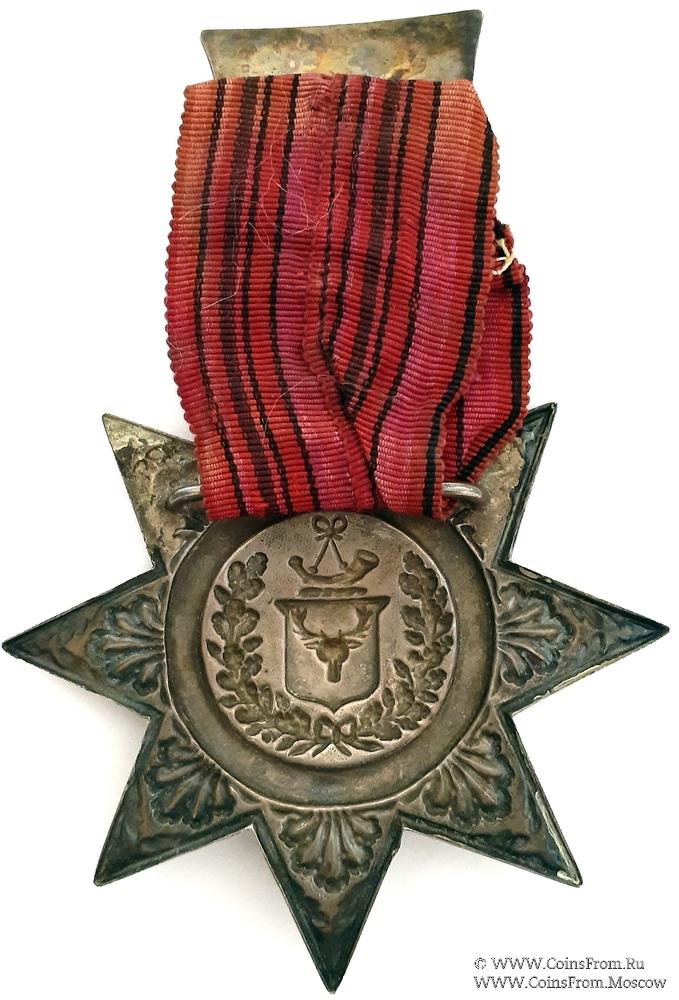 Аверс: в форме восьми конечной звезды. Каждый луч украшен орнаментом из листьев. В центре в двойном круге малый герб в виде щита с изображением головы оленя. На щите через бурелет расположен клейнод в виде охотничьего рога на ленте. На двойном круге клейма: голова Королевы, лев, якорь, h – Бирмингем, 1882 г.