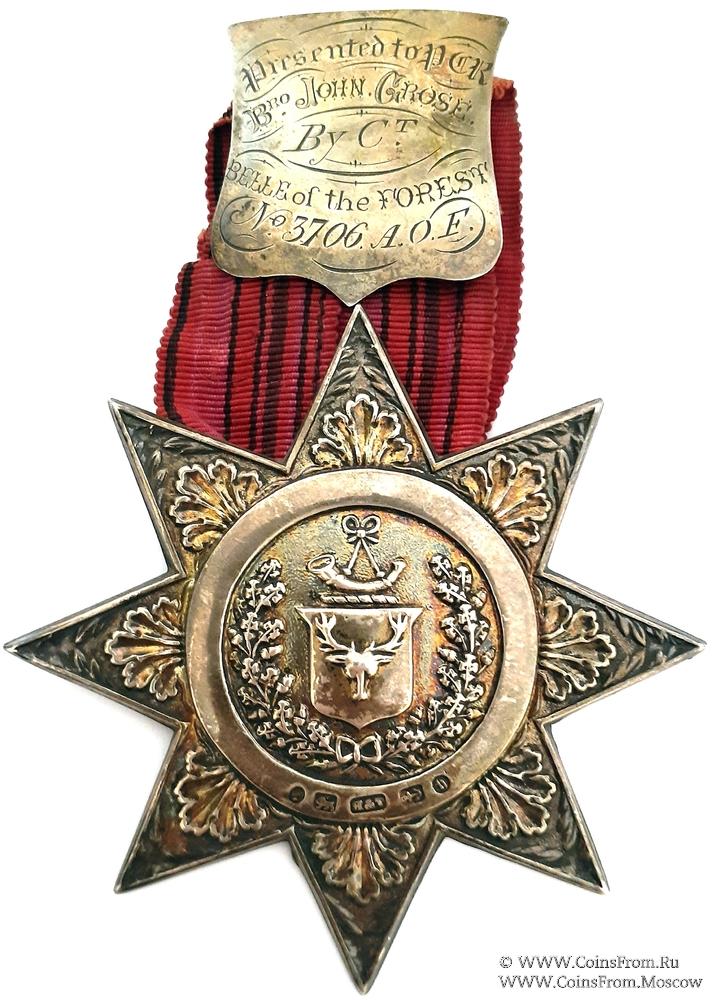 Колодки/медальон: медальон в форме щита с гравировкой: Presented to PСR (Past Chief Ranger – Прошлый Главный Рейнджер) Bro. John Grose by Ct (Court – суд – название Лож в Ордене) Belle of Forest № 3706 A.O.F. (AOF – The Ancient Order of Foresters - Старинный Орден Лесников). Вручён Прошлому Главному Рейнджеру Брату John Grose по решению Суда Belle of Forest № 3706 Старинного Ордена Лесников.