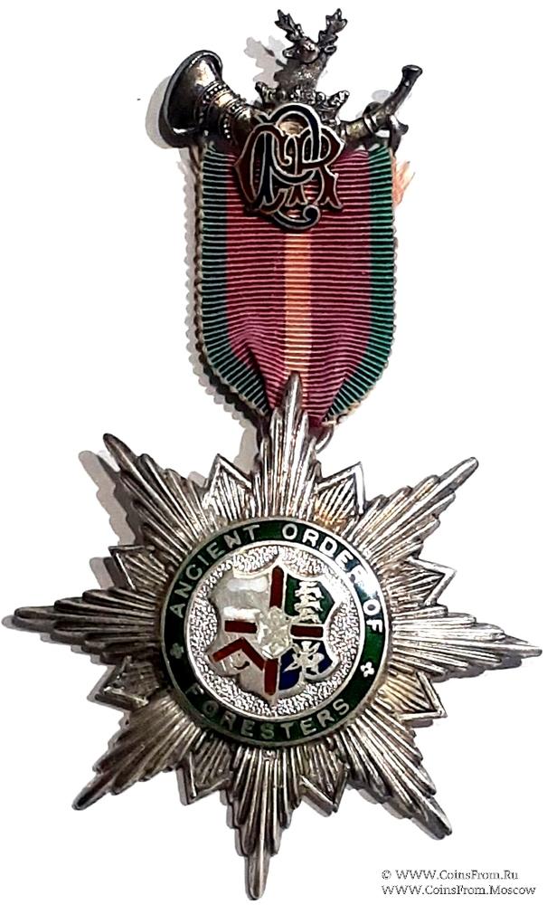 Аверс: в форме двух наложенных друг на друга восьмиконечных звёзд. В центре выпуклый круг, по краю которого наименование Ордена на зелёном фоне Ancient Order of Foresters, в центре объёмное изображение щита с символами Ордена.