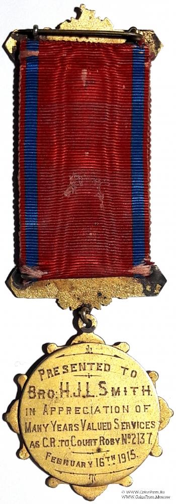 Реверс: Гравировка: Presented to Bro. H.J.L. Smith in Appreciation of Many Years Valued Services as C.R. to Count Roby № 2137. February 16TH 1915 - Вручён брату H.J.L. Smith в знак признательности за многолетнюю службу в качестве CR. (Chief Ranger - Главный рейнджер). Count Roby № 2137. 16 февраля 1915 года.