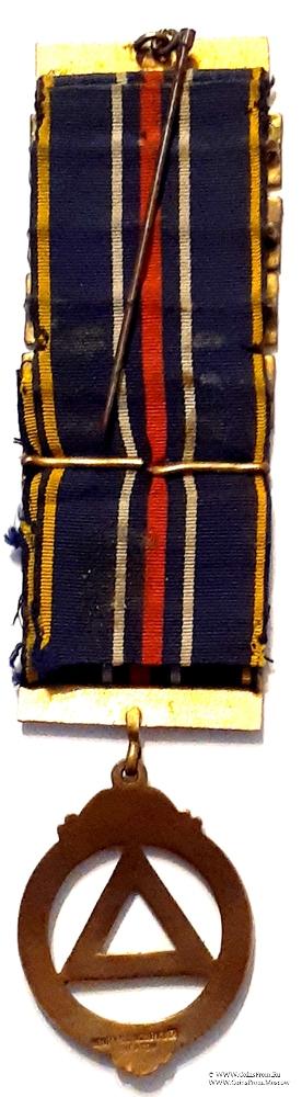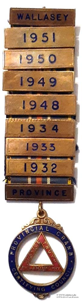 Колодки/медальон: верхняя и нижняя колодки в форме медного прямоугольника с наименованием провинции PROVINCE WALLASEY. Верхняя колодка с иглой для носки, нижняя – с крючком для подвески знака. На ленте 7 медальонов с годами 1932, 1933, 1934, 1948, 1949, 1950, 1951. Даты благотворительных взносов.