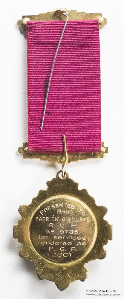 На реверсе знака гравировка: BRO. PATRICK O,ROURKE R.O.H. AB 9785 FOR SERVICES RENDERED FS P.G.P. (Provincial Grand Primo) 2001 – Брату PATRICK O,ROURKE рыцарю Ордена Свиток Чести (досточтимый сэр) (4-й степени) за оказанные услуги Гранд Примо (руководителя Ложи) в 2001 г.