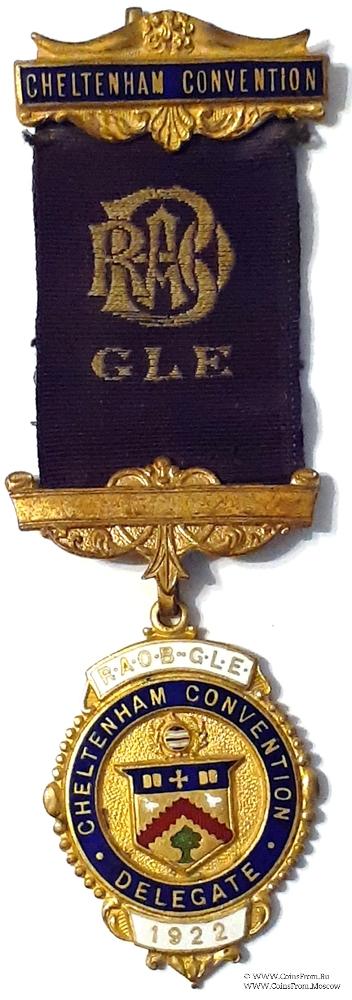 Колодки/медальон: верхняя колодка в виде прямоугольника. Снизу прямоугольника орнамент, сверху- рога буйвола. На прямоугольнике на синей эмали надпись: CHELTENHAM CONVENNION – конвенция CHELTENHAM (Че́лтнем (Курорт Челтнем; Cheltenham) — крупный курорт в граф-стве Глостершир, Англия, недалеко от Глостера и Сиренстера). Верхняя колодка с иглой для носки, нижняя – с крючком для подвески знака в форме ленты на фоне стилизованного орнамента.