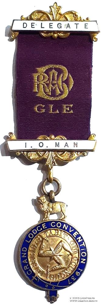 АВЕРС: круг, образованный подвязкой из ремня синей эмали с надписью: Grand Lodge Convention 1937. Внутри подвязки надпись по кругу. Jiegeris Stabit Quocunque. В центре Трискелион - символ в виде трёх бегущих ног, выходящих из одной точки. Исторически символ встречается у разных народов. В настоящее время является официальным геральдическим символом Сицилии и острова Мэн. Верх знака украшен изображением пумы.