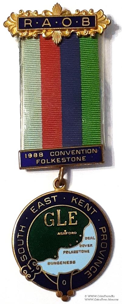 Колодки/медальон: верхняя колодка в виде прямоугольника на фоне орнамента и аббревиатурой Ордена RAOB. Верхняя колодка с иглой для носки, нижняя – с крючком для подвески знака и над-писью: 1988 Convention Folkestone - Конвенция 1988 Года Фолкстон.
