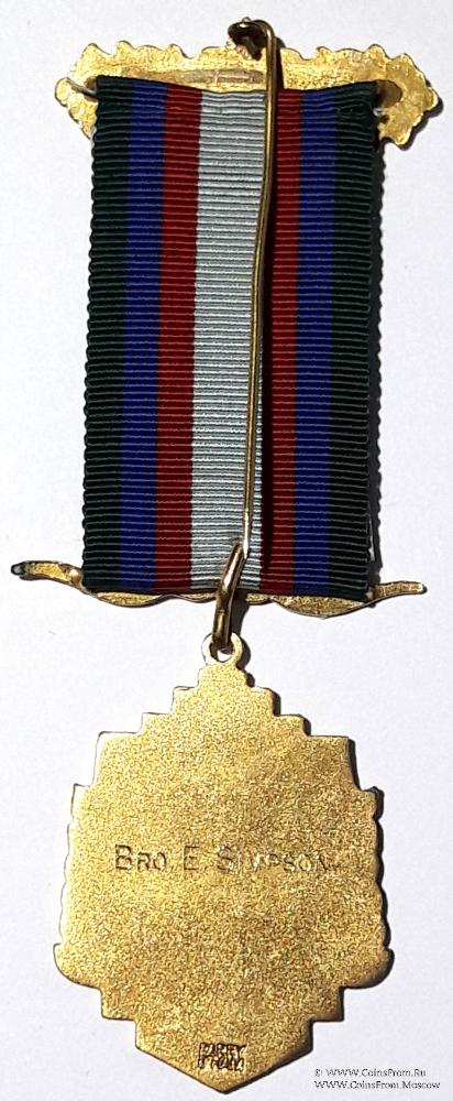 Знак в форме трапеции с рисунком цветной эмалью. На рисунке здание Ложи на фоне леса, ниже которого изображение охотничьего рога. С боков рисунок обрамлён венком. выше и ниже рисунка на лентах синей эмали название и номер Ложи HORNCHURCH LODGE № 6921 GLE.