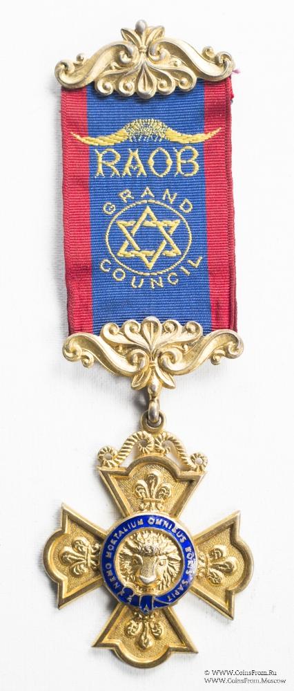 Лента знака синяя с красными полосами по бокам. По центру ленты вышивки: рога буйвола, RAOB, гексаграмма в круге, вокруг надпись GRAND COUNCIL Великий Совет ROYAL ANTEDILUVIAN ORDER OF BUFFALOES (RAOB)- Старинный Королевский Орден Буйволов. Англия.