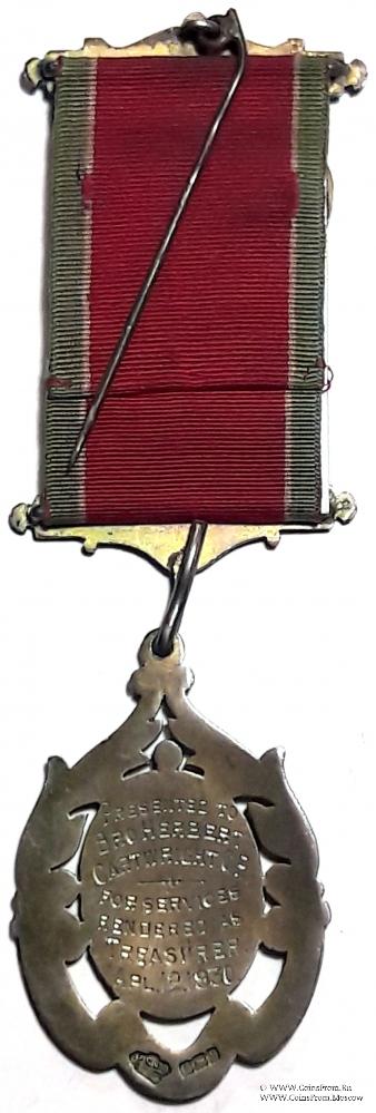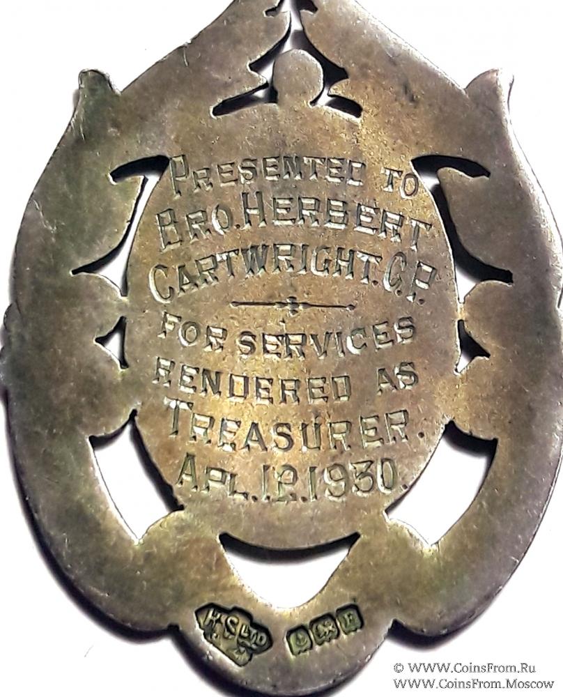 В центре знака на овале изображение двух перекрещенных ключей (символ казначея). Верхняя часть овала обрамлена орнаментом. В нижней части на ленте синей эмали наименование и номер Ложи: BRUCE LGE1332.Гравировка на реверсе знака: PRESENTED TO BRO. HERBERT CARTWRIGHT C.P. FOR CERVICES RENDERED AS TREASURER APL 12.1930 – вручён Брату HERBERT CARTWRIGHT сертифицировано Первый за услуги оказанные в качестве Казначея.