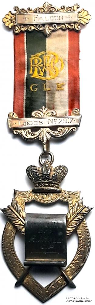 Колодки/медальон: верхняя и нижняя колодки в виде прямоугольника на фоне орнамента. На верхней колодке наименование Ложи, на нижней – номер. В центре ленты золотошвейная вышивка аббревиатуры Ордена RAOB GLE.