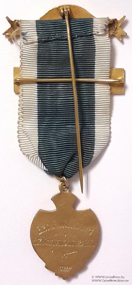 Лента небесно-голубая с белыми полосами по бокам. Верхняя колодка в виде рогов буйвола с перекинутой лентой и надписью названия Ложи TWICKENHAM LODGE. Игла для ношения с обратной стороны. В центре ленты медальон прямоугольной формы с надписью 53 ATTENDANCES 1952 – За посещаемость в 1952-53 году. В низу лента продета непосредственно в кольцо знака.