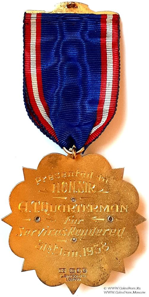РЕВЕРС: гравировка Presented Hon. Sir. A.T. Quarterman For Services Rendered 31 Jan.1938. Вручён достопочтенному Сэру A.T. Quarterman за оказанные услуги в 1938 году. Клейма: LS, лев, голова, B. L.Simpson&Co London. Выпуск Лондон, 1937 год.