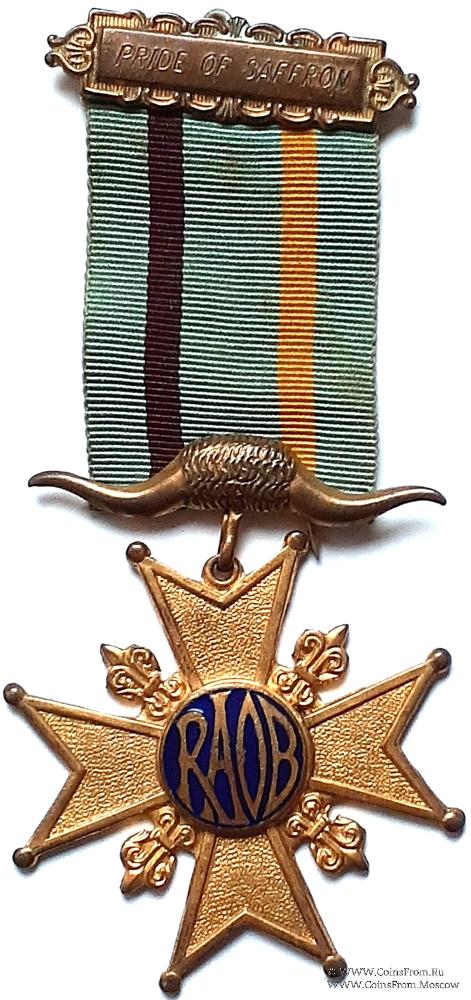 АВЕРС: в виде мальтийского креста. Каждый из 8 лучей заканчивается шариком. В квадрантах креста вставки в виде символического изображения трилистника. В центре круг синей эмали, внутри которого аббревиатура Ордена RAOB.