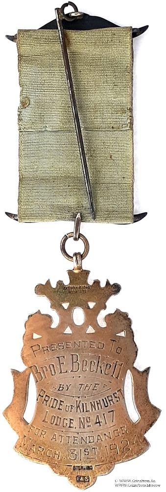 РЕВЕРС: гравировка: Presented To Bro. E. Beckett by the Pride of Kilnhurst lodge № 417 for Attendance. March 31st 1924. (За посещаемость в 1924 г.). Клейма: Fattoriny & Sons. Bradford. F7S. Sterling.