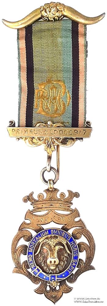 КОЛОДКИ/МЕДАЛЬОН: верхняя колодка в виде полых рогов буйвола и иглой для ношения. Нижняя колодка в виде ленты на фоне стилизованного орнамента с наименованием и номером Ложи ( Primrose Lodge 917).