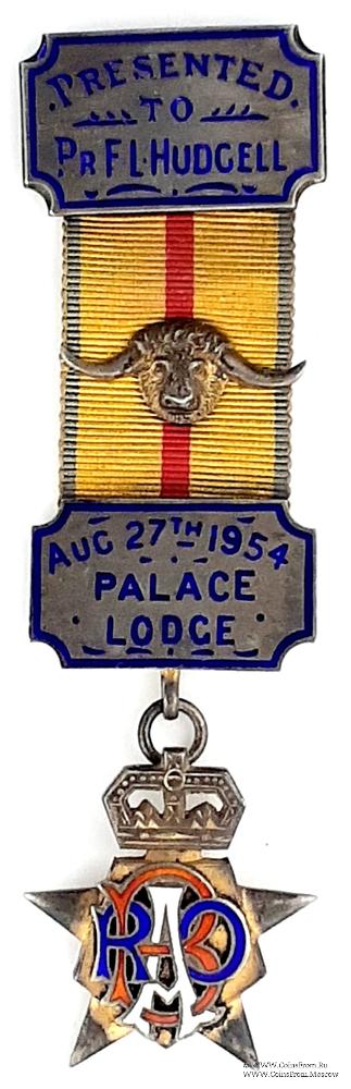 На нижней колодке – Aug. 27 th 1954 Palace Lodge. В центре ленты металлический медальон в виде объёмной головы буйвола.