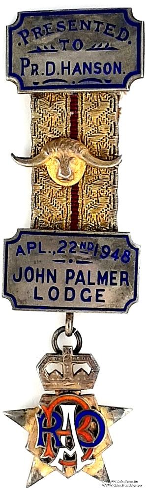 КОЛОДКИ/МЕДАЛЬОН: верхняя и нижняя колодки одинаковые в форме прямоугольника с вырезанными углами золотого цвета. Надписи и рамки синего цвета. На верхней колодке – Presented to Pr. D. Hanson. На нижней колодке – Apr. 22nd 1948. John Palmer Lodge. В центре ленты металлический медальон в виде объёмной головы буйвола.