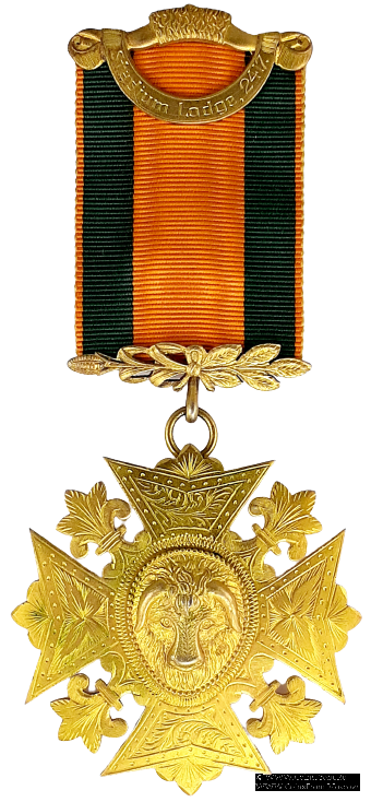 КОЛОДКИ/МЕДАЛЬОН: верхняя колодка в виде рогов буйвола с перекинутой лентой, на которой наименование и номер Ложи Stadium Lodge 2417. Нижняя колодка в виде двухстороннего букета. В левую сторону - из кукурузы, в правую - из оливковой ветви.