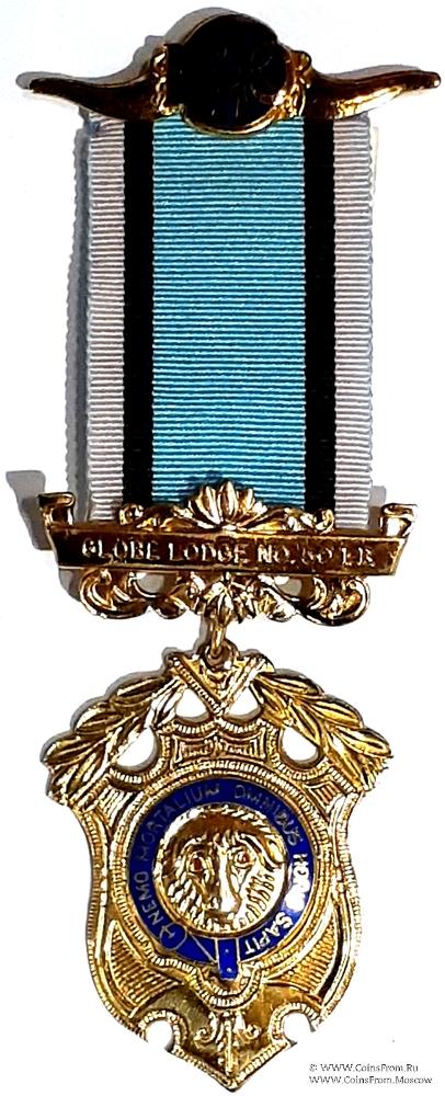 КОЛОДКИ/МЕДАЛЬОН: верхняя колодка в виде рогов буйвола с аббревиатурой Ордена в центре. Нижняя колодка в виде прямоугольника на фоне стилизованного орнамента с наименованием и номером Ложи Globe Lodge № 50 I.B.