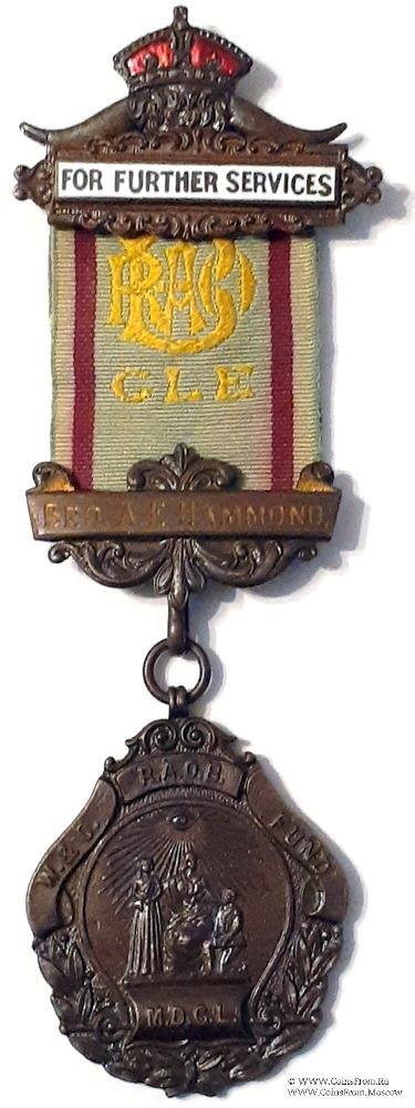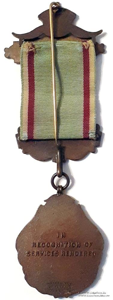 Колодки/медальон: верхняя колодка двойная. Основная часть в виде прямоугольника в орнаменте с надписью For Further services - Для дальнейшего обслуживания. Вторая часть в виде рогов буйвола, увенчанных короной. Верхняя колодка с иглой для носки на второй части, нижняя – с крючком для подвески знака в форме ленты на фоне стилизованного орнамента. Надпись: Bro. Hammond.