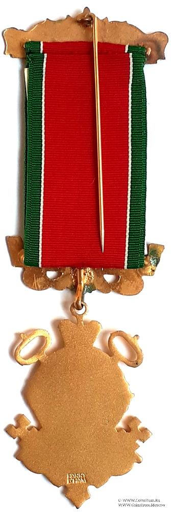 Колодки/медальон: верхняя колодка в виде прямоугольника сверху с орнаментом. Надпись TREAS-URER – Казначей. Нижняя колодка в виде ленты на фоне орнамента с наименованием и номером Ложи (SIR. JOHN RACKHAM LGE 3657). По центру ленты вышивка с аббревиатурой ордена RAOB.