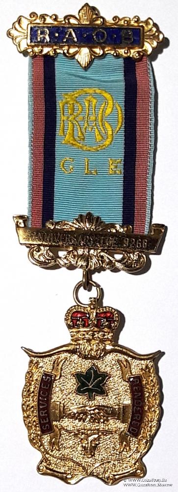 Знак на ленте голубого цвета с розовой и коричневой полосой по бокам с вышивкой аббревиатуры Ордена RAOB GLE. Верхняя колодка в форме прямоугольника на фоне орнамента с аббревиатурой Ордена RAOB. Нижняя колодка в форме пластины на фоне стилизованного орнамента с надписью на английском языке ANNIVERSARY LGE 9268 – годовщина Ложи 9268.