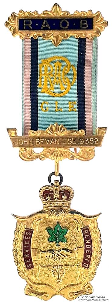 КОЛОДКИ/МЕДАЛЬОН: верхняя колодка в форме синего прямоугольника на фоне орнамента с аббревиатурой Ордена RAOB. Нижняя колодка в форме ленты на фоне стилизованного орнамента с наименованием и номером Ложи - John Bevan LGE 9352.