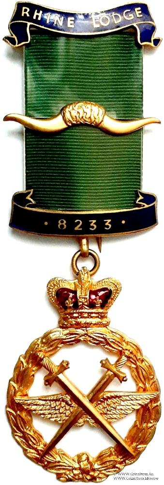 КОЛОДКИ/МЕДАЛЬОН: верхняя и нижняя колодки в виде изогнутой лены синей эмали. На верхней колодке наименование Ложи Rhine Lodge. На нижней колодке номер ложи 8233. В центре ленты медальон в виде рогов буйвола.