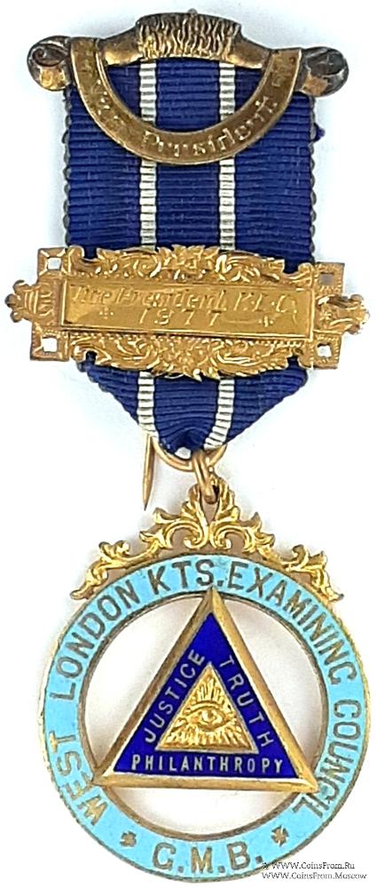 АВЕРС: двойной круг голубой эмали с надписью - West London KTS. Examining Council G.M.B. На круге накладной треугольник синего цвета с надписью – Justice, Truth, Philanthropy. В центре треугольника «Лучезарная дельта» или всевидящее око на фоне лучей. Верх знака украшен орнаментом.