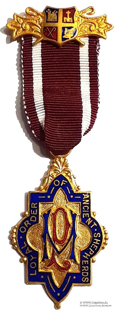 АВЕРС: по контуру знака на ленте синей эмали наименование Ордена: Loyal Order of Ancient Shepherds. В центре знака вязь из букв PM (Past Master) Прошлый Мастер.