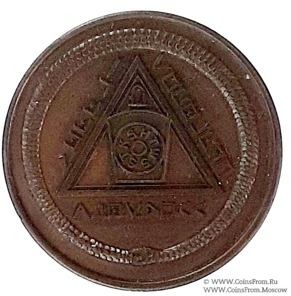 АВЕРС: круглой формы с чётко выраженным буртиком от гурта. Диаметр 33 мм. На аверсе в центре изображение подвески в форме замкового камня с английскими буквами HTWS-STKS (HIRAM, TYRIAN WIDOW*S SON, SENDETH TO SOLOMON) – Хирам, сын вдовы Тириана, направленный к царю Соломону. Замковый камень помещён в равносторонний треугольник с символами по сторонам. Всё это помещено в круг, образованный змеёй, кусающей себя за хвост (уроборос).