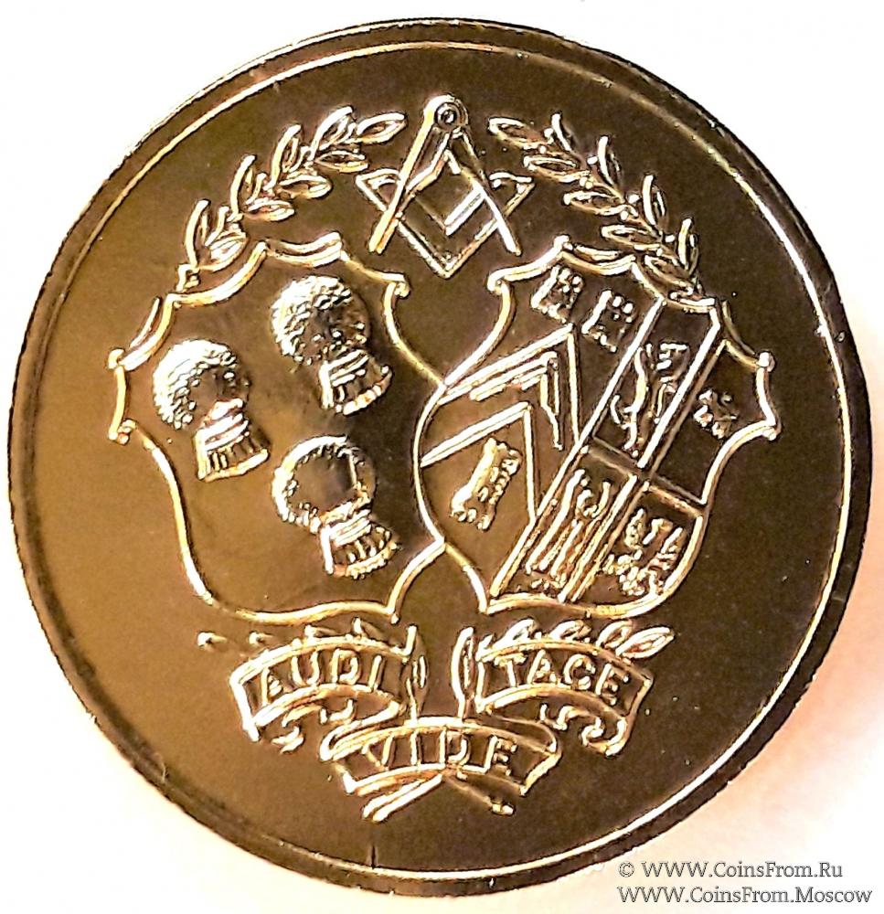 Чеширский благотворительный жетон. Аверс слегка выпуклый с двумя щитами - элементами гербов. Справа герб Великой Ложи Англии, слева герб Графа Честер (этот титул с 1301 г. Присваивается только принцам Уэльским, наследникам английского престола). Ниже щитов на ленте с ветвями девиз ВЛА на латыни AUDI, VIDE, TACE – слушай, смотри и молчи. Сверху щитов в ветвях акации наугольник и циркуль. В углу наугольника 4 точки.