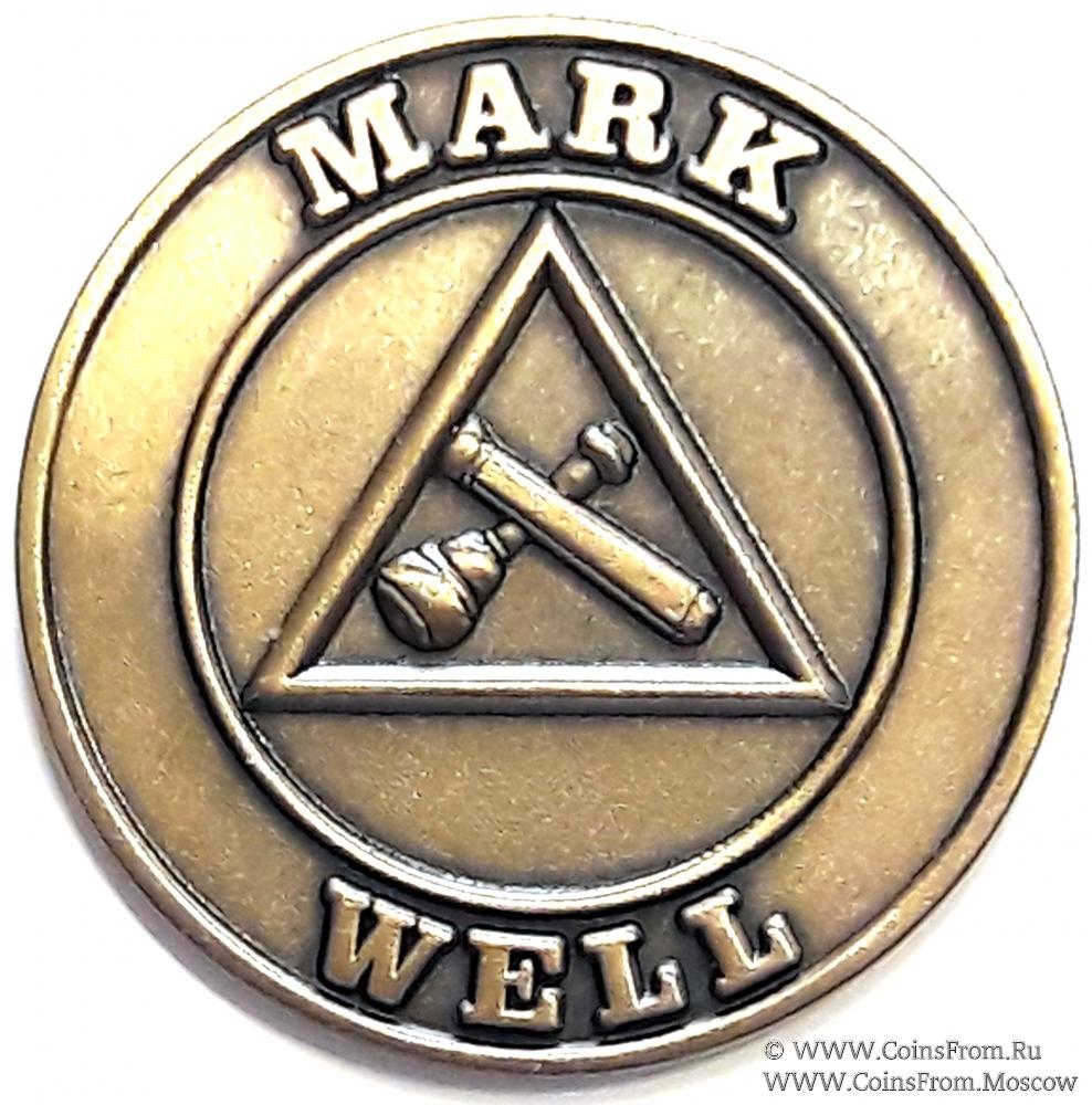 Реверс: в центре в треугольнике, заключённом в двойной круг, изображение символов Мастеров Метки, скрещённых резец (зубило) и масонский молоток. По кругу надписи на английском языке: MARK WELL.