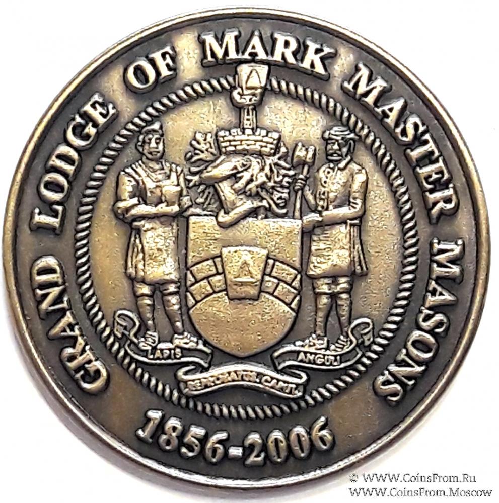 Аверс: круглой формы с чётко выраженным буртиком от гурта. Диаметр 31.8 мм. В двойном круге надпись: GRAND LODGE OF MARK MASTER MASONS 1856 – 2006. 150 лет Великой Ложе Масонов Мастеров Метки. В центре символическое изображение Мастеров Метки с девизом, написанным на ленте, служащей подножием для щитодержателей на латыни: Lapis Reprobatus Caput Anguli ((Латынь)– Камень пренебрежённые вами зиждущими, но сделавшийся главою угла).