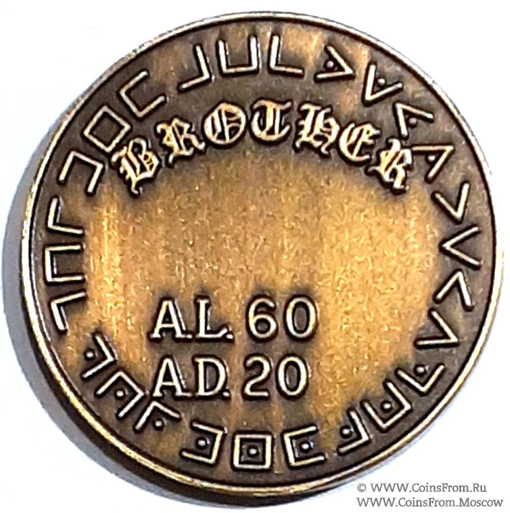 Реверс: по кругу надпись тайным масонским шифром. Вверху надпись стилизованными буквами BROTHER (Брат). В нижней части надписи, обозначающие дату: A.L. 60 и A.D. 20.
