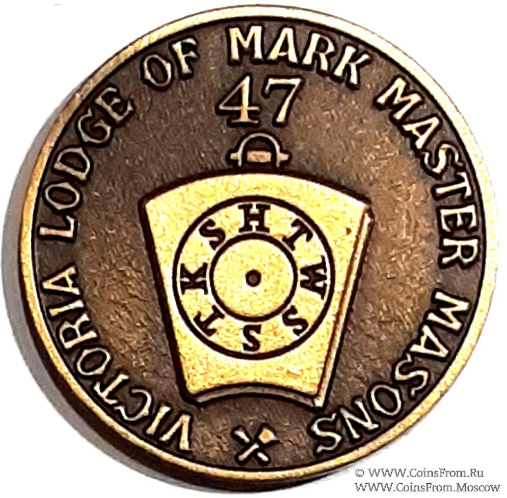 Аверс: круглой формы с буртиком от гурта. Диаметр 29 мм. По кругу наименование Ложи: Victoria Lodge of Mark Master Masons. Начало и конец надписи разделены перекрещенными зубилом и молотком. В центре символическое изображение символа Мастеров Метки Замкового камня. Выше изображения камня номер Ложи 47.