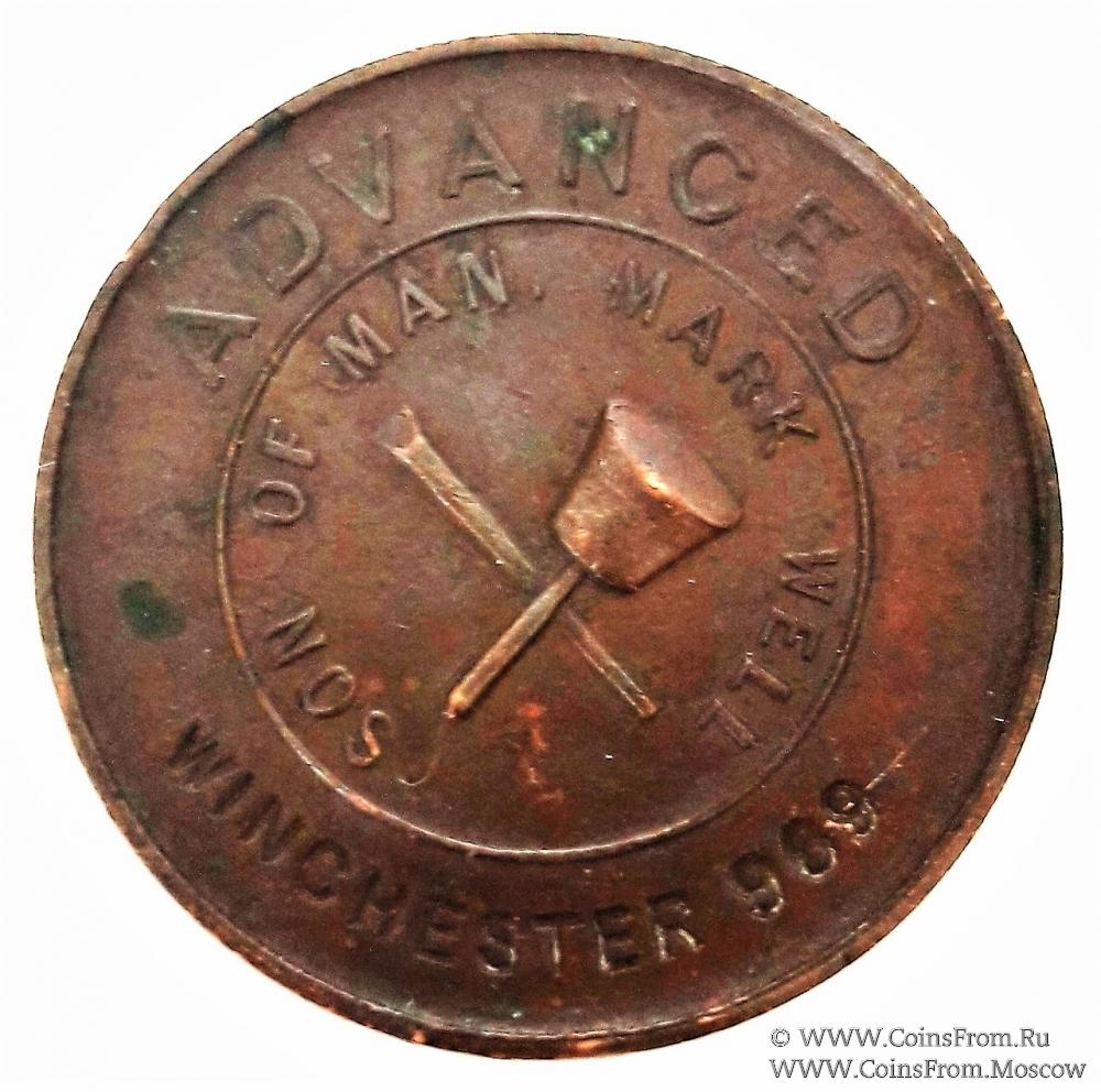 На реверсе жетона в центре изображение символов Мастеров Метки скрещённых резец (зубило) и масонский молоток. По кругу надписи на английском языке: ADVANCED SON OF MAN. MARK WILL. WINCHESTER 969. (Передовой (возвышенный) сын человека. Хорошая метка). Ложа «Winchester 969».