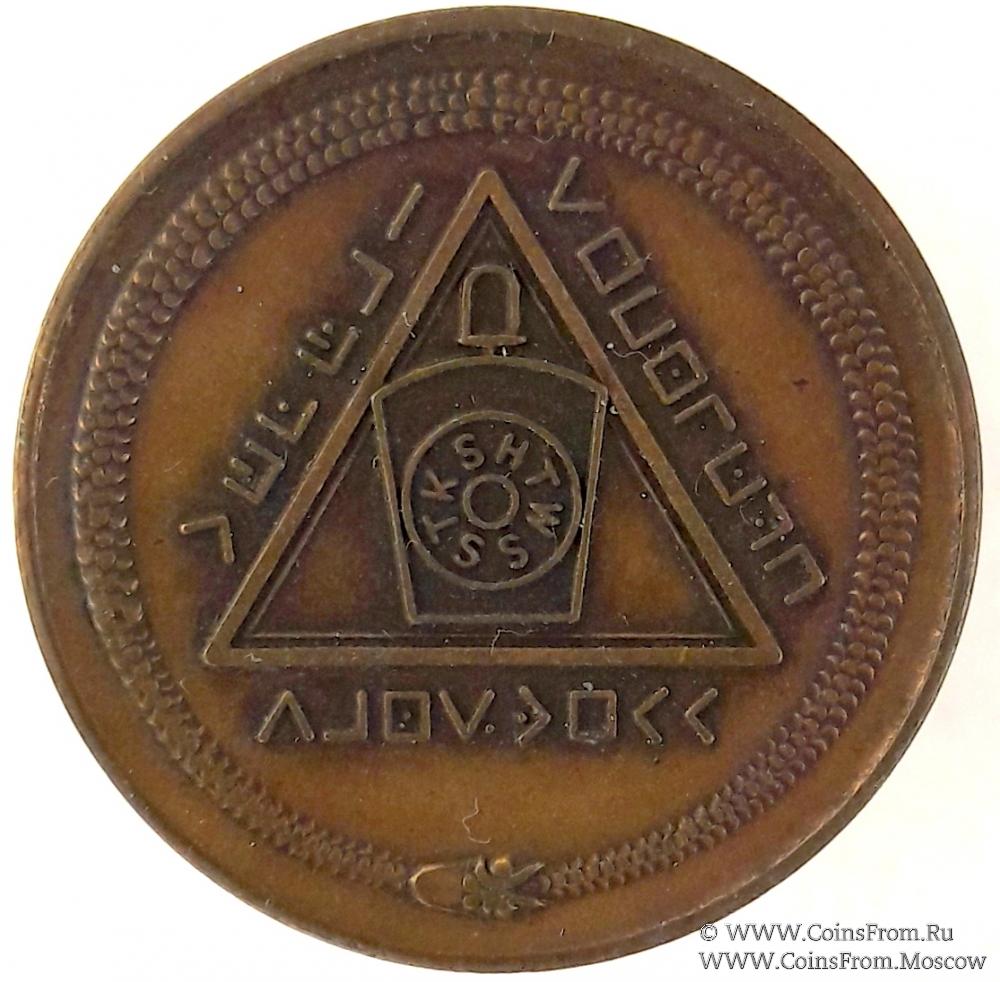 Жетон круглой формы с чётко выраженным буртиком от гурта. Диаметр 33 мм. На аверсе в центре изображение подвески в форме замкового камня с английскими буквами HTWS-STKS (HIRAM, TYRIAN WIDOW*S SON, SENDETH TO SOLOMON) – Хирам, сын вдовы Тириана, направленный к царю Соломону. Замковый камень помещён в равносторонний треугольник с символами по сторонам. Всё это помещено в круг, образованный змеёй, кусающей себя за хвост (уроборос).