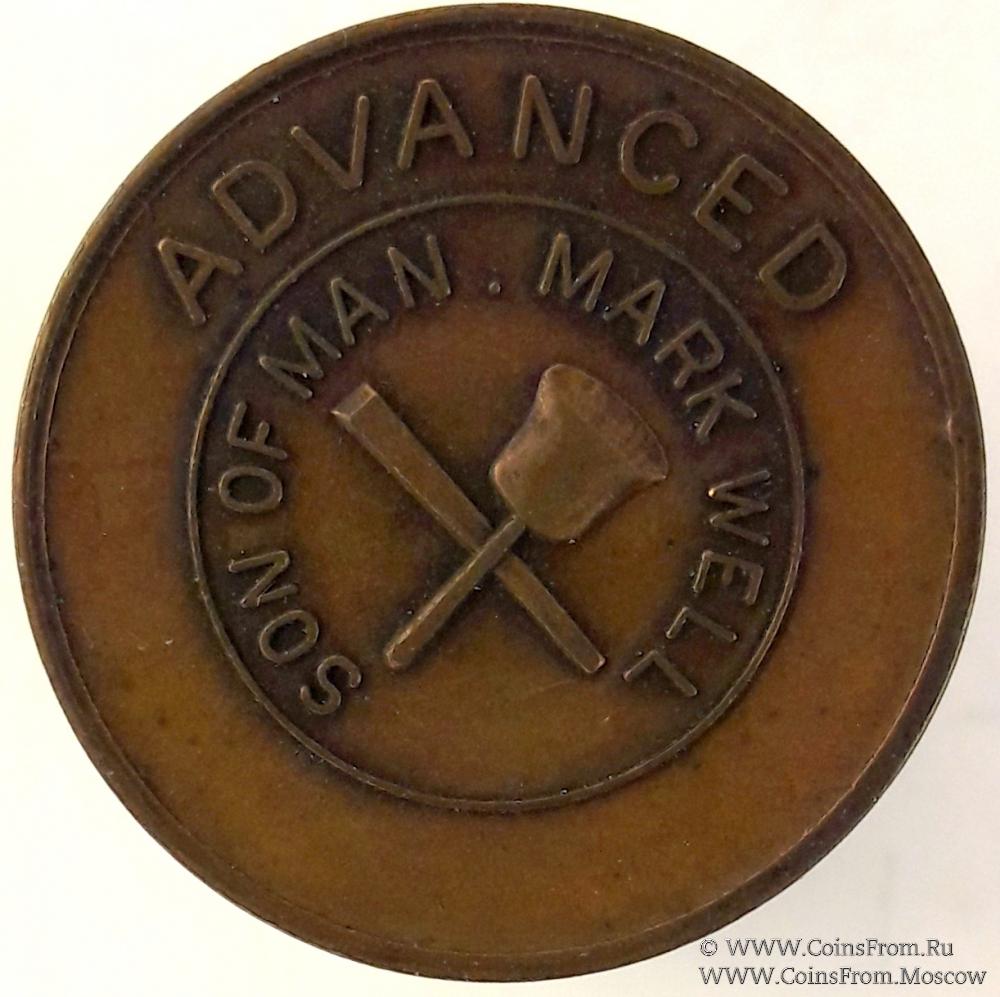 На реверсе жетона в центре изображение символов Мастеров Метки скрещённых резец (зубило) и масонский молоток. По кругу надписи на английском языке: ADVANCED SON OF MAN. MARK WILL. (Передовой (возвышенный) сын человека. Хорошая метка).