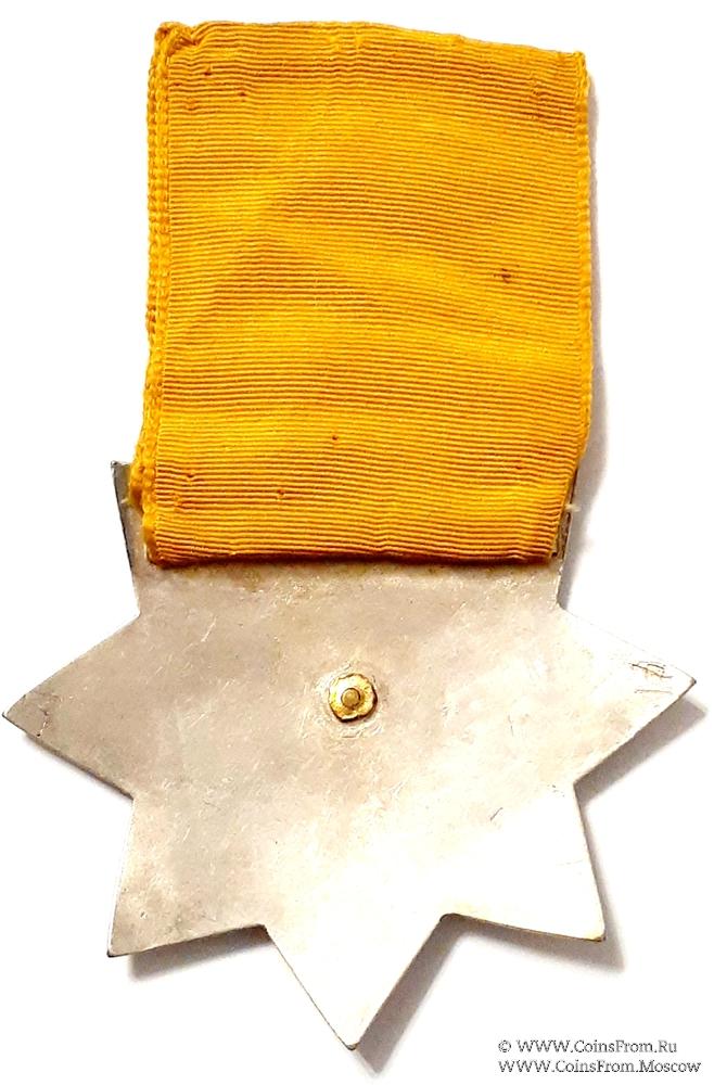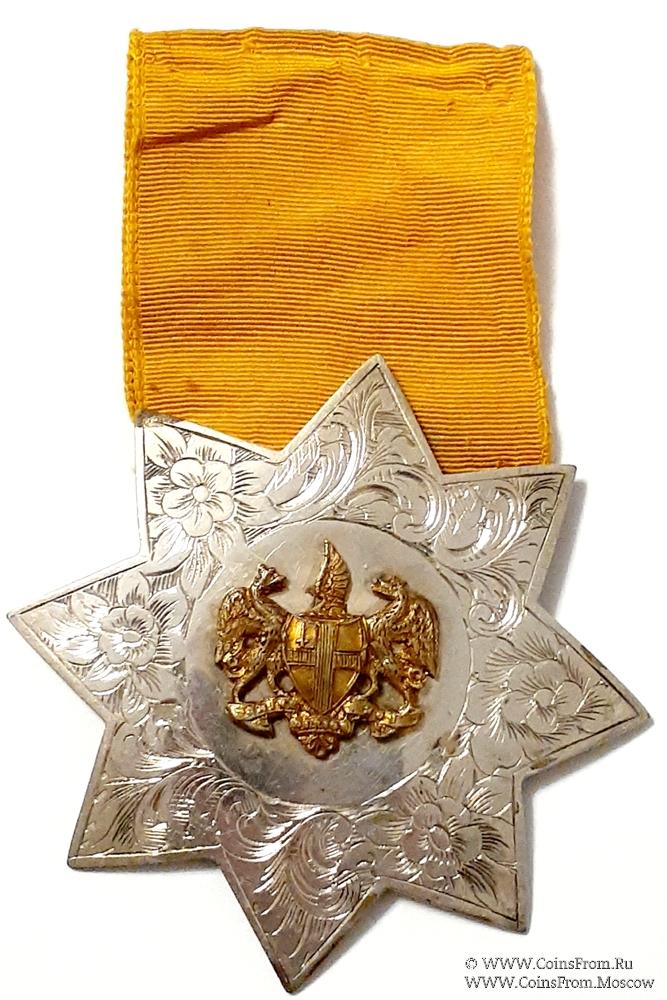 АВЕРС: в форме восьмиконечной звезды. Все лучи украшены орнаментом с цветами. В центре накладной герб в виде щита, щитодержателей, девизной ленты, клейнода в виде драконьего крыла, размещённого на бурелете. В качестве щитодержателей изображены мифические драконы с крыльями. На щите изображён крест (символ Святого Георгия). В правой (геральд.) верхней четверти изображён меч (символ Святого Павла). На девизной ленте надпись на латыни: Domine Dirice Nos (Господи, направь нас). (герб Сити Лондона).